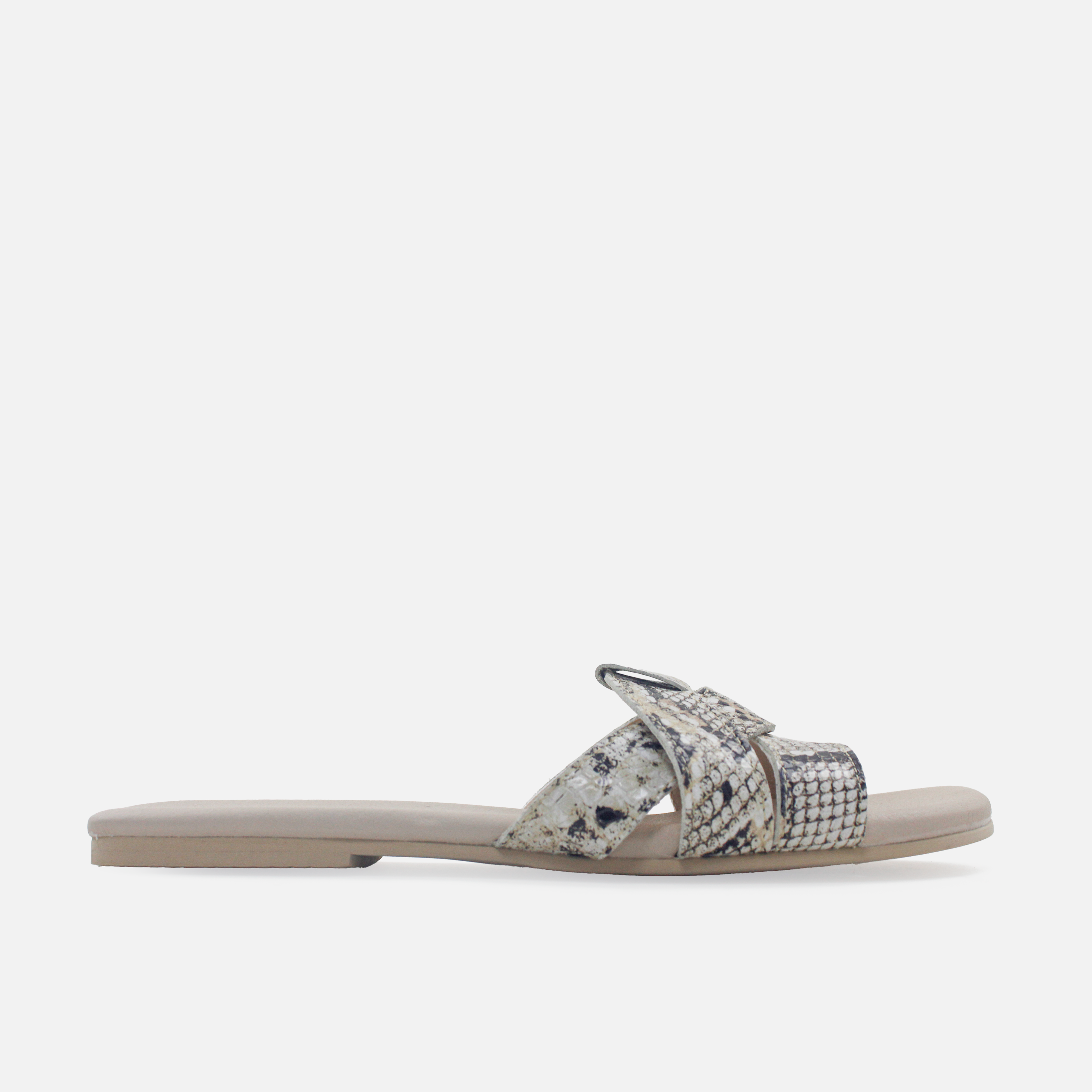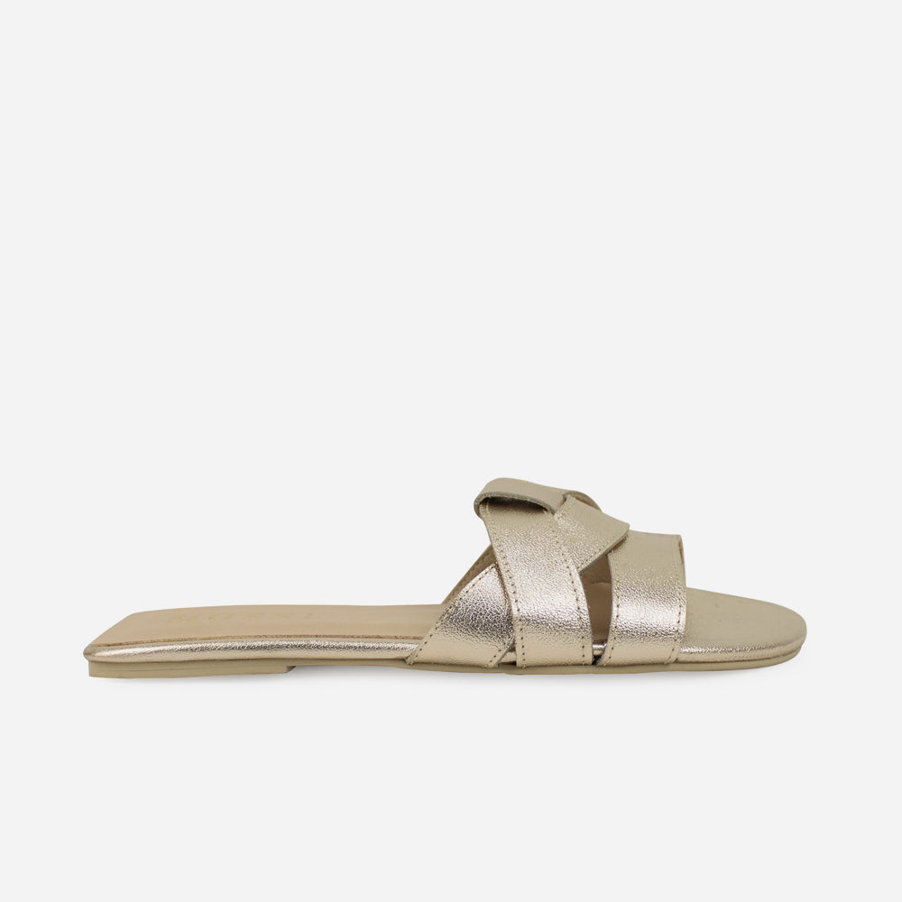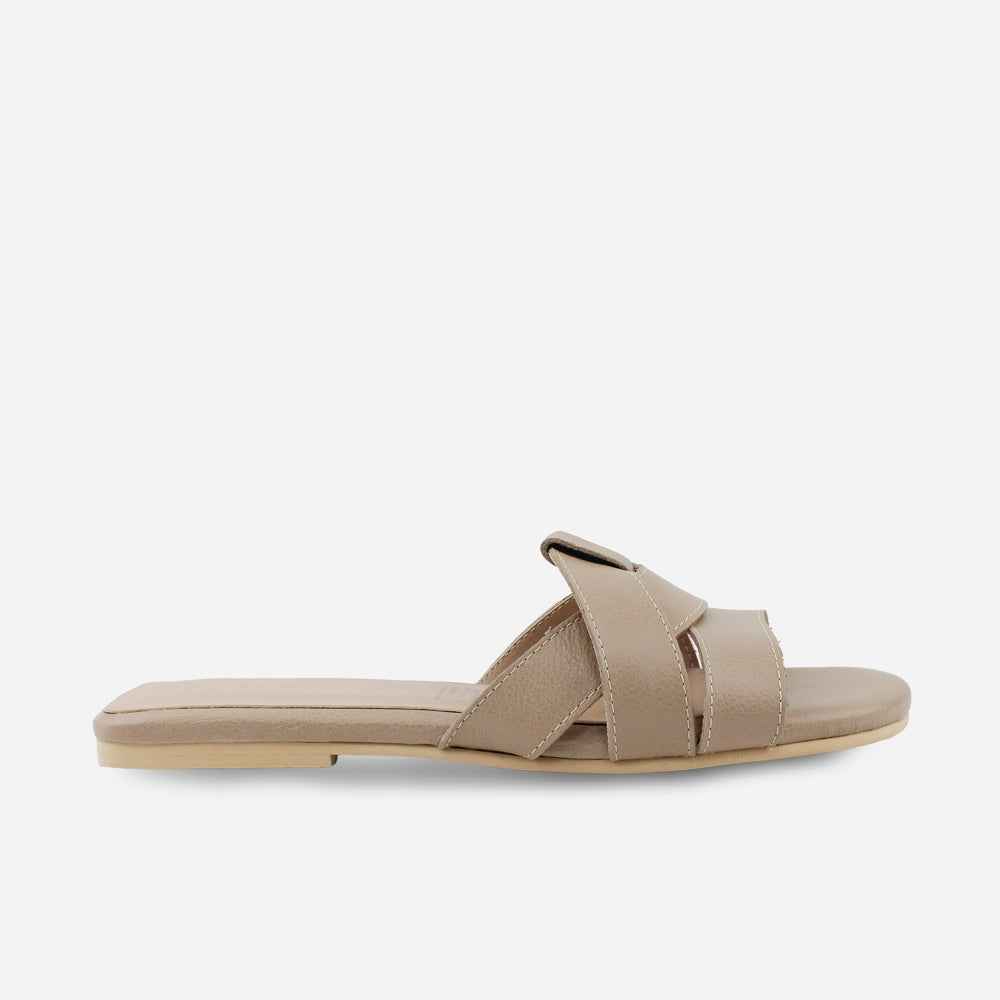 Sandalia plana con capellada en cuero, con suela en sintético de 1 cm de altura y forro interno en sintético. Ideales para paseos salidas informales o dias de playa.