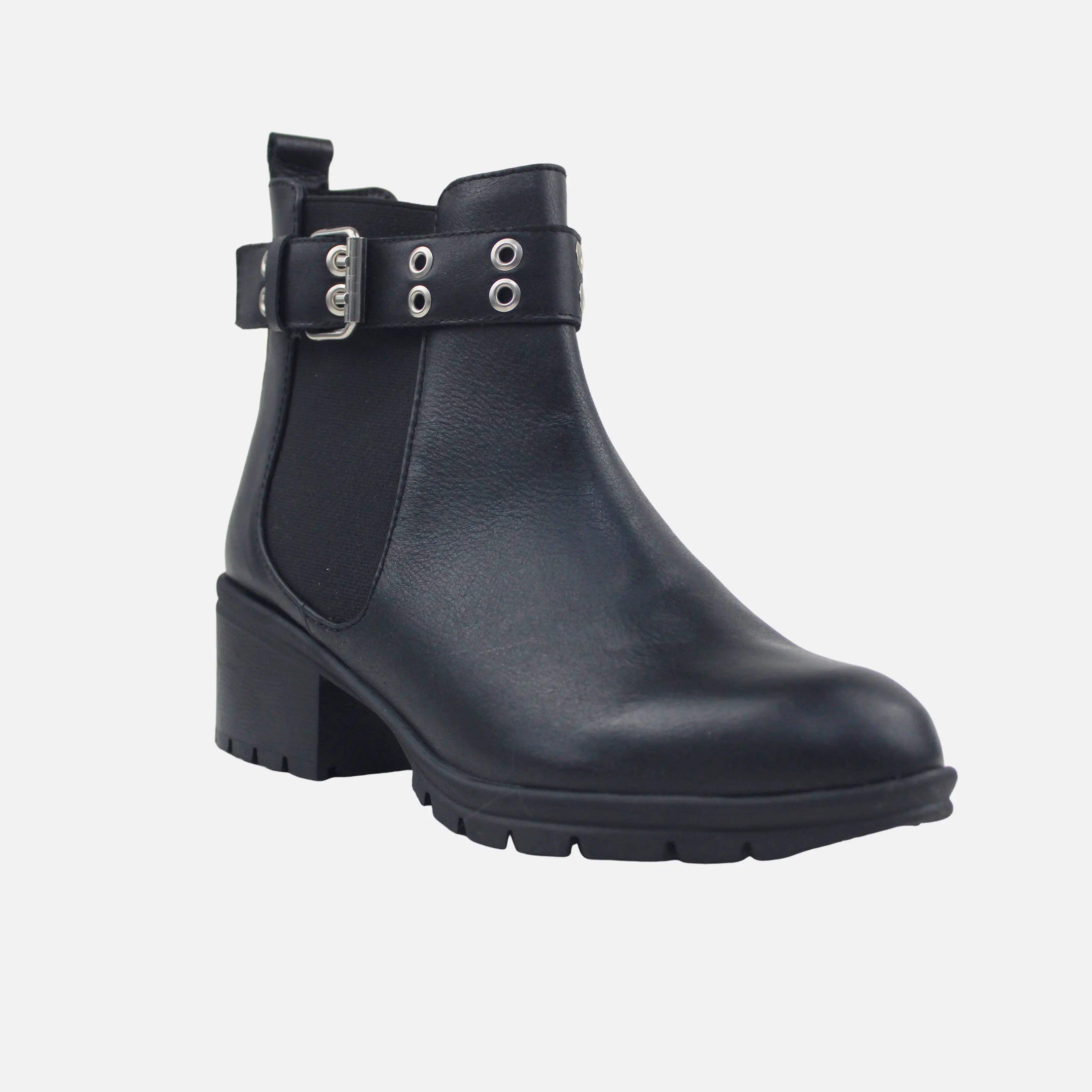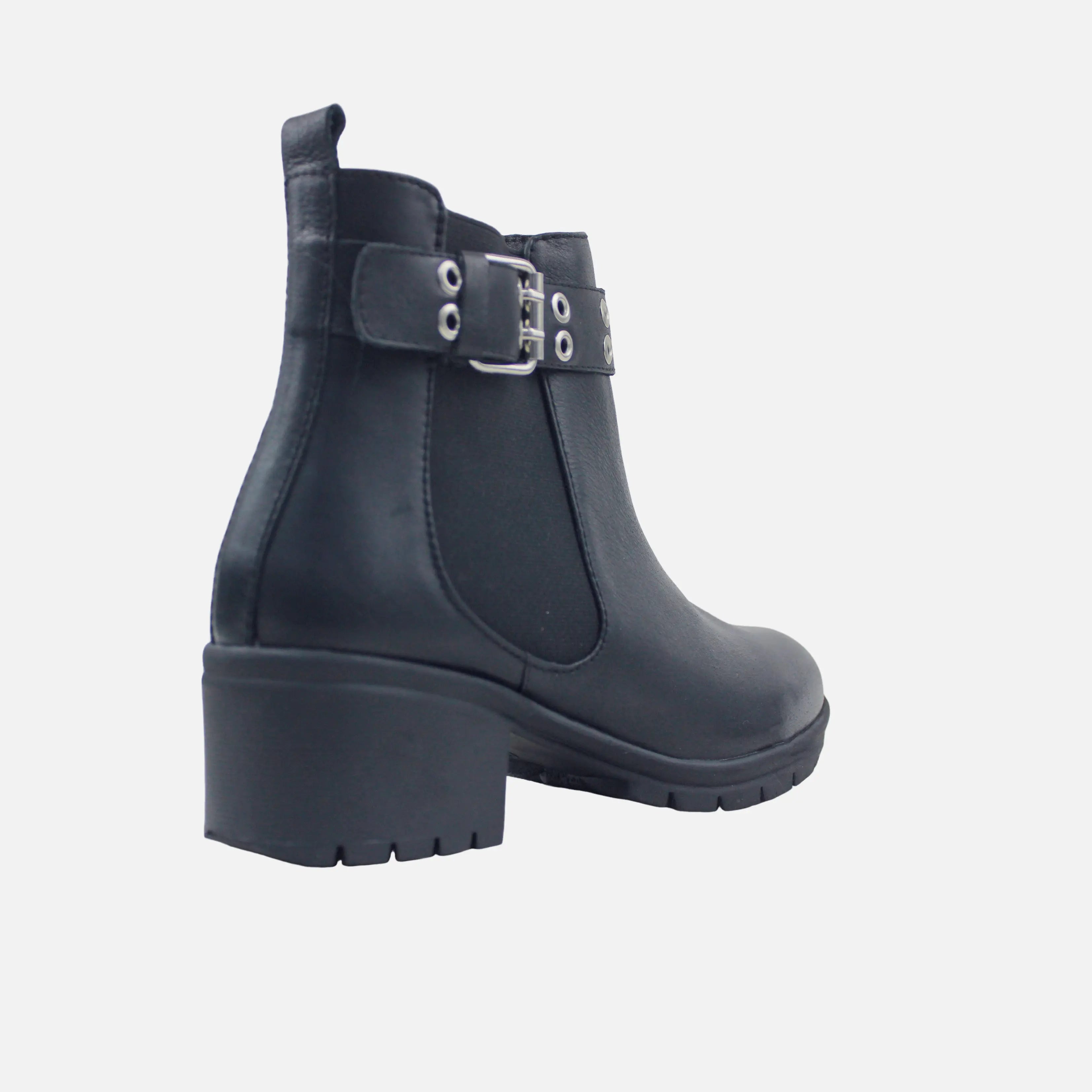 Botin tacon con capellada en cuero, con suela en sintético de 4 cm de altura y forro interno en sintético. Botín con tacón medio y suela robusta que aporta altura y estabilidad sin perder confort. El detalle de la hebilla metálica con ojales le da un aire urbano y contemporáneo, ideal para combinar con jeans ajustados o vestidos midi en los días más fríos.