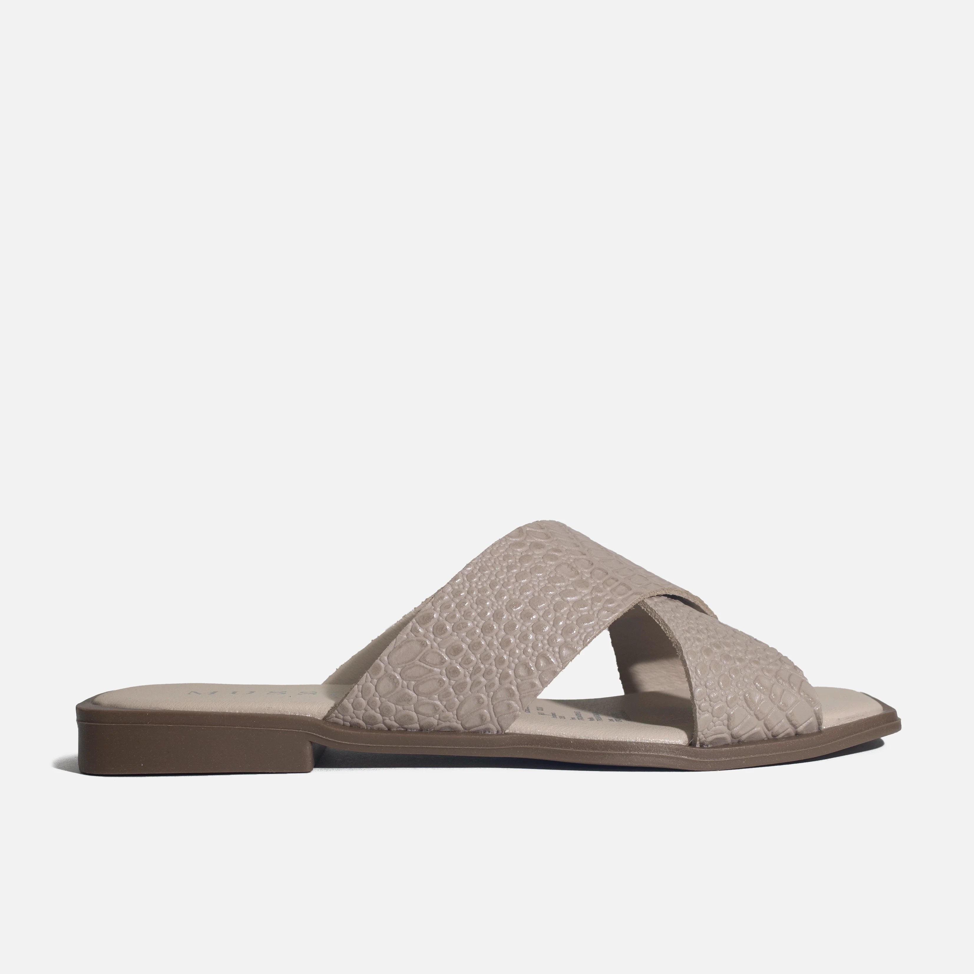 Sandalia plana con capellada en cuero, con suela en sintético de 2 cm de altura y forro interno en sintético. Sofisticada y versátil, ideal para looks casuales con un toque chic. Su diseño liviano y estilizado ofrece comodidad en cada paso, perfecta para acompañar vestidos fluidos o jeans. Un básico moderno que combina elegancia y frescura en los días cálidos.