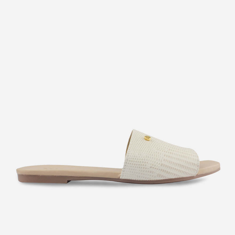 Sandalia plana con capellada en cuero, con suela en sintetico de 2 cm de altura y forro interno en sintético. Silueta casual con cuero grabado. Combinalo con vestidos casuales o jeans.
