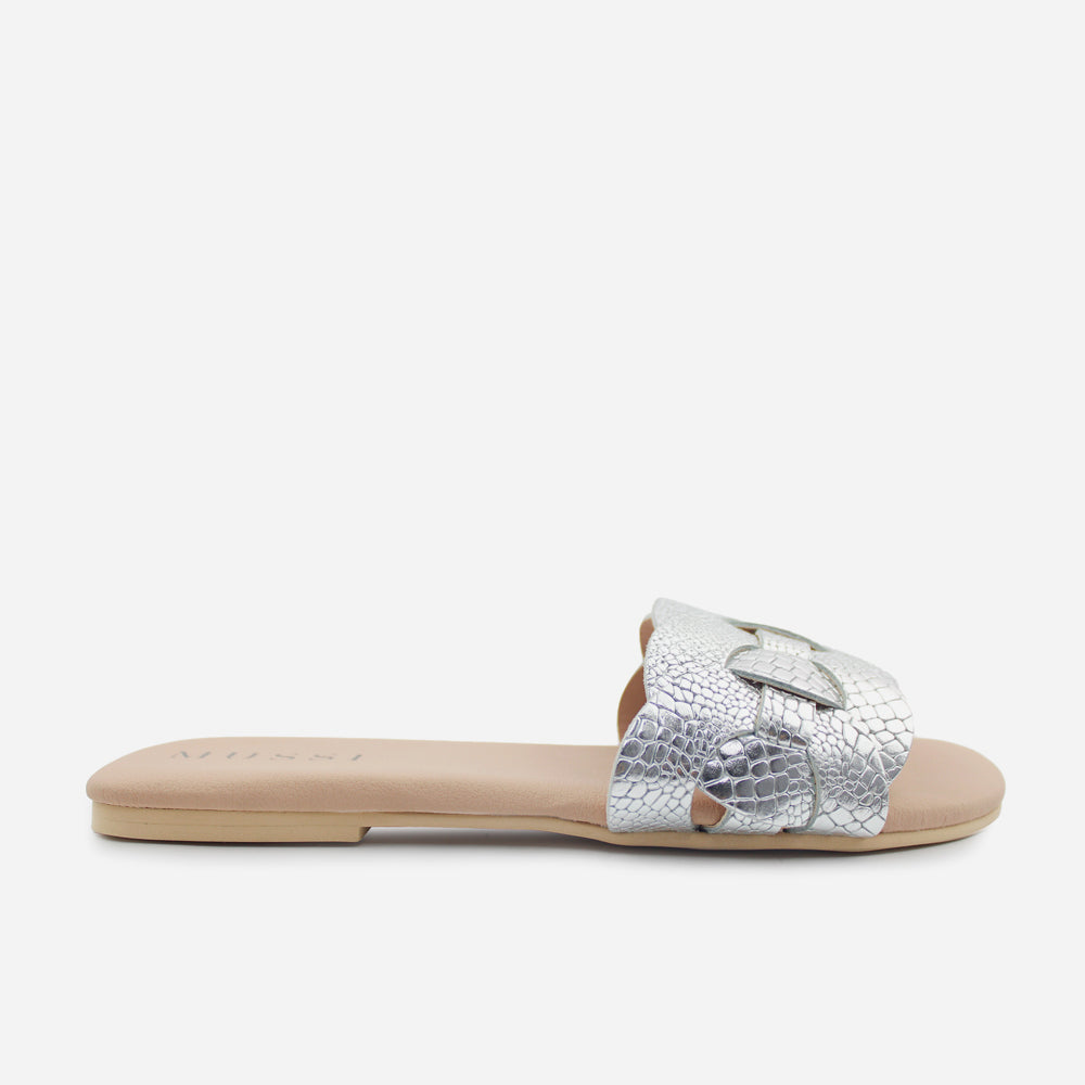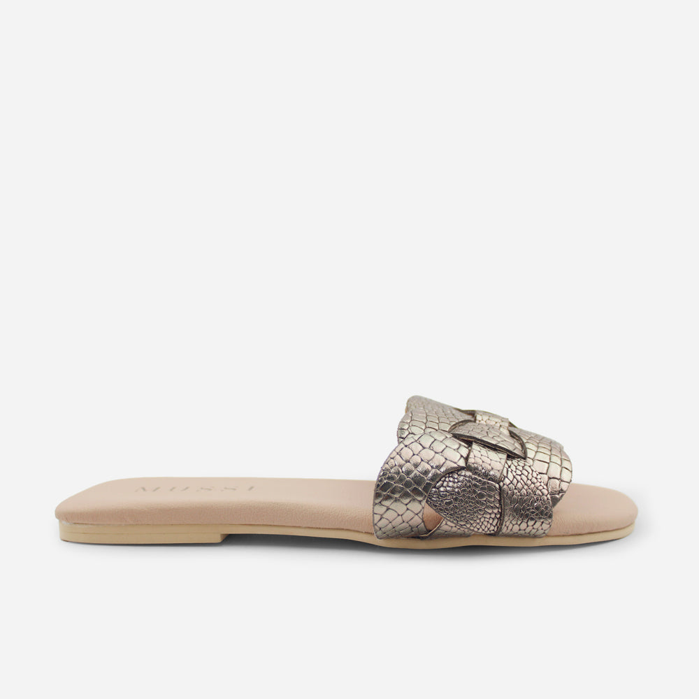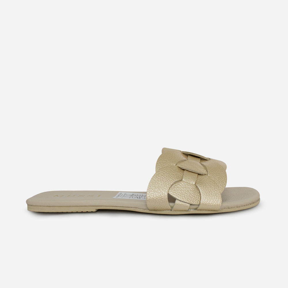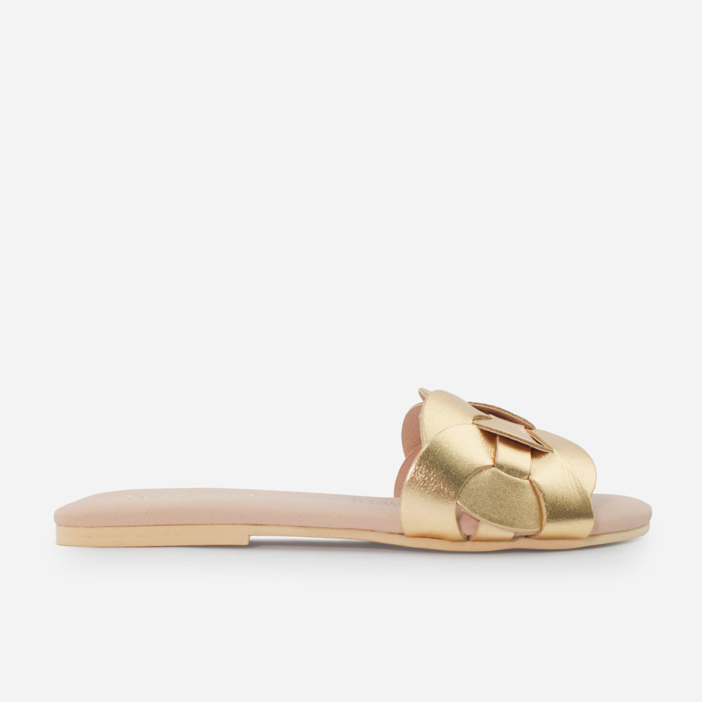 Sandalia plana con capellada en cuero, con suela en sintético de 1 cm de altura y forro interno en sintético. Una forma delicada y femenina con una estructura suave y confortante, nuestra sandalia plana es una opción perfecta para añadirle textura a tus outfit y estar lista para los eventos del día