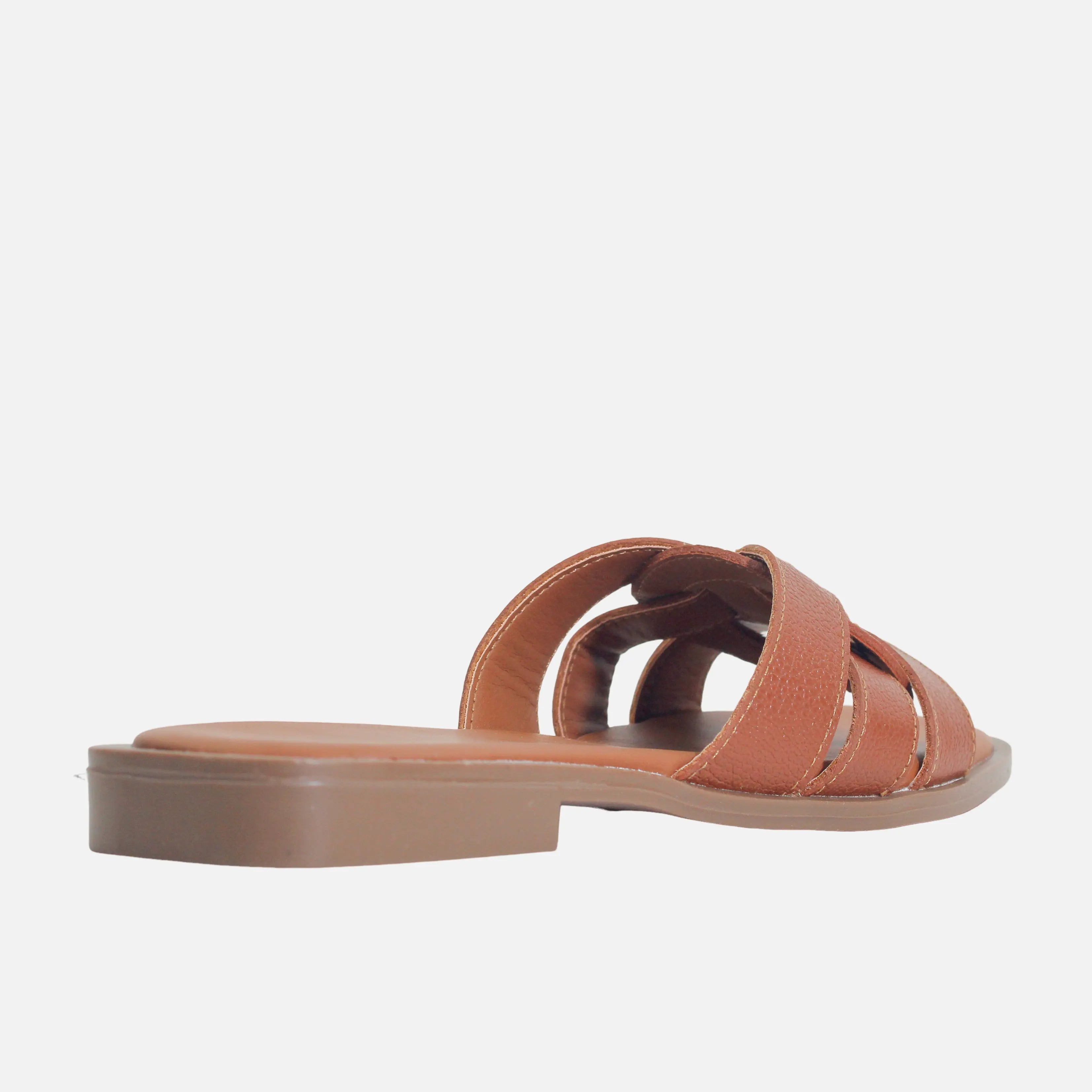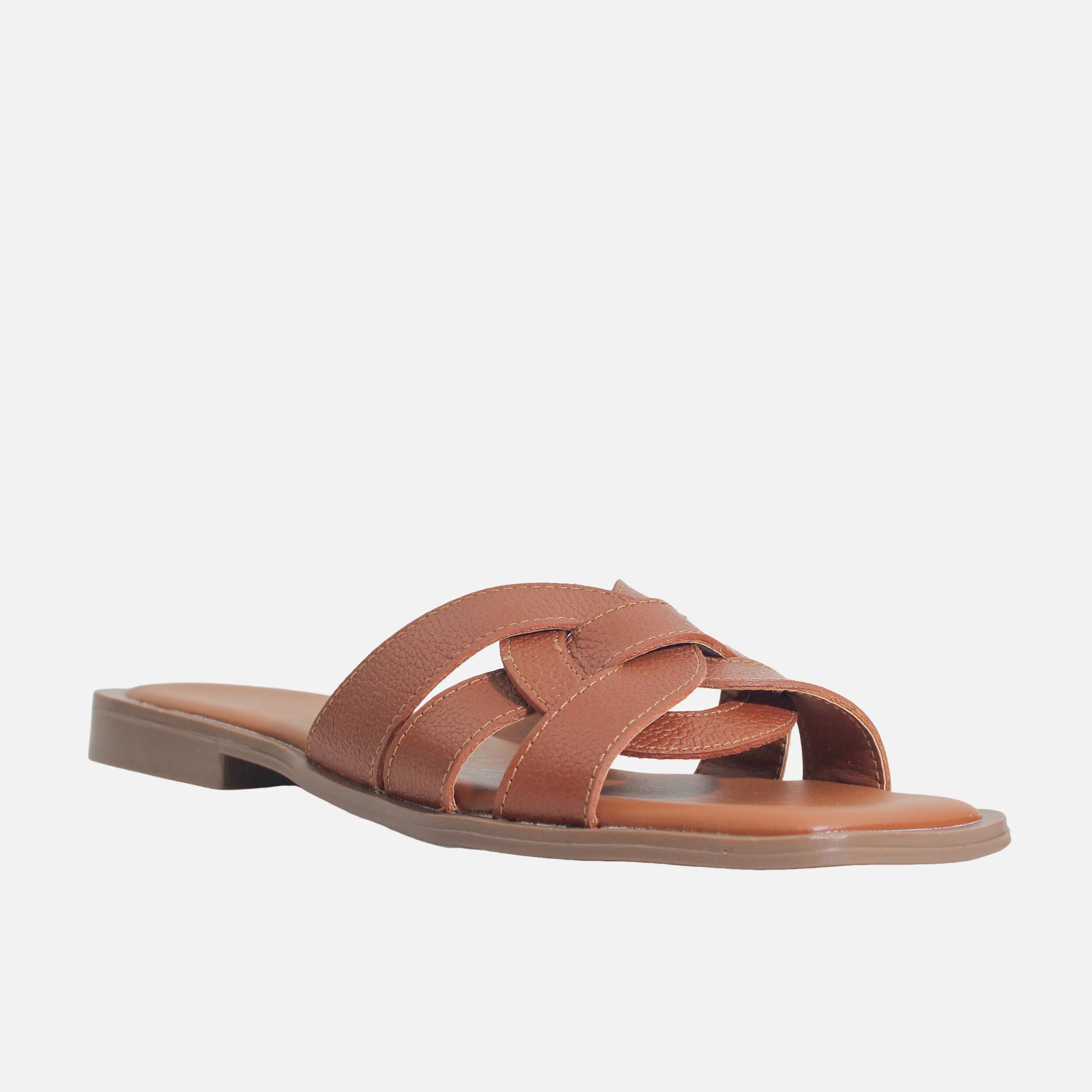 Sandalia plana con capellada en cuero, con suela en sintético de 2 cm de altura y forro interno en sintético. Versátil y ligera, perfecta para los días soleados. Su diseño minimalista se adapta a cualquier look casual o relajado, brindando frescura y comodidad al caminar.