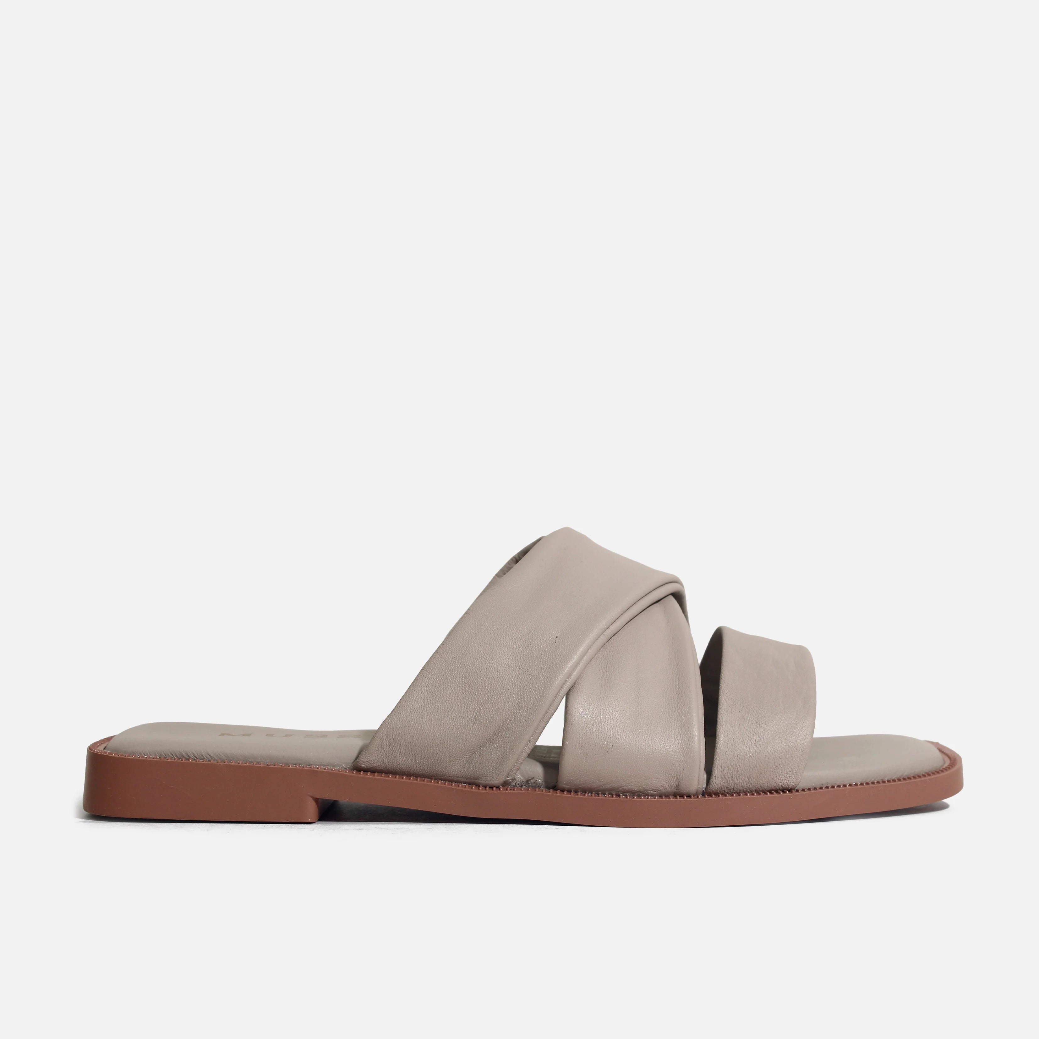 Sandalia plana con capellada en cuero, con suela en sintético de 2 cm de altura y forro interno en sintético. Sandalia plana femenina con diseño moderno, perfecta para looks relajados y urbanos.