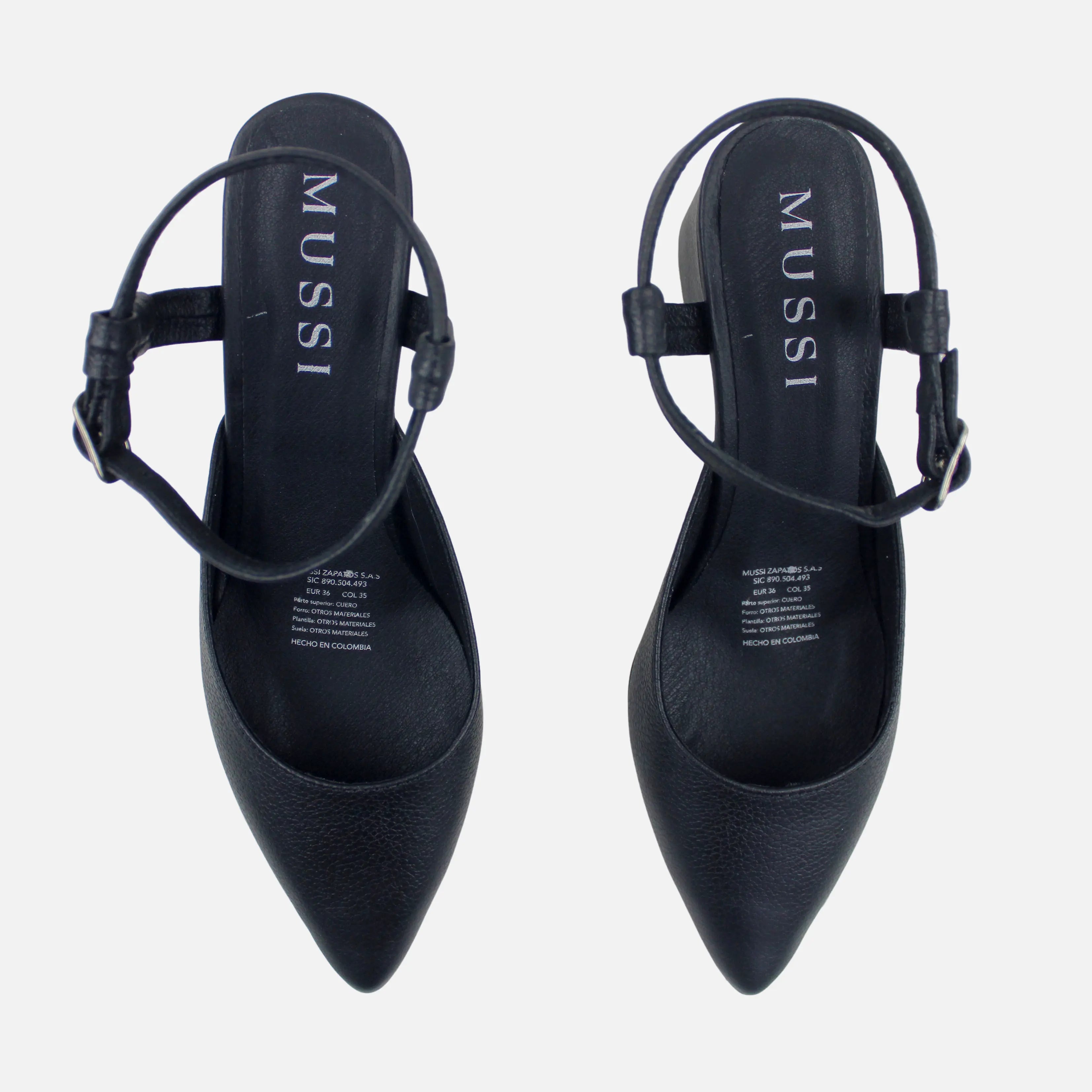 Tacones con capellada en cuero, con suela en sintético de 6 cm de altura y forro interno en sintético. Tacón medio y pulsera ajustable que brinda soporte y estilo. Su diseño de punta fina estiliza el pie y combina fácilmente con looks de oficina, vestidos midi o jeans rectos. Perfecto para elevar cualquier atuendo con un toque sutil y sofisticado.