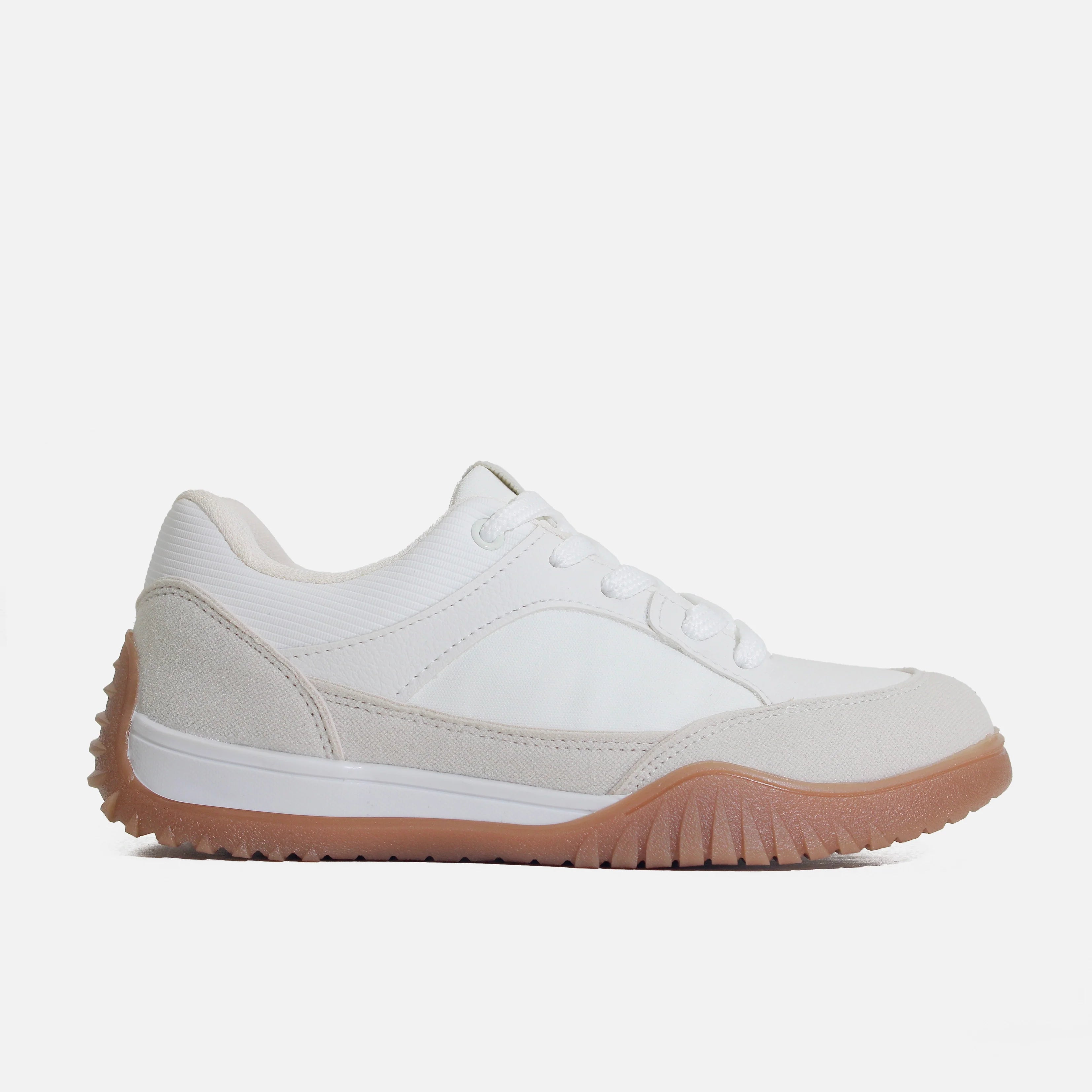 Tenis con capellada en sintético, con suela en sintético de 3 cm de altura y forro interno en sintético. Deportivo blanco con diseño moderno y estructura urbana. Su capellada combina diferentes acabados que aportan textura y estilo. Suela en goma color maní con efecto volumen, brindando una pisada cómoda y actual. Perfecto para un look casual o sporty chic.