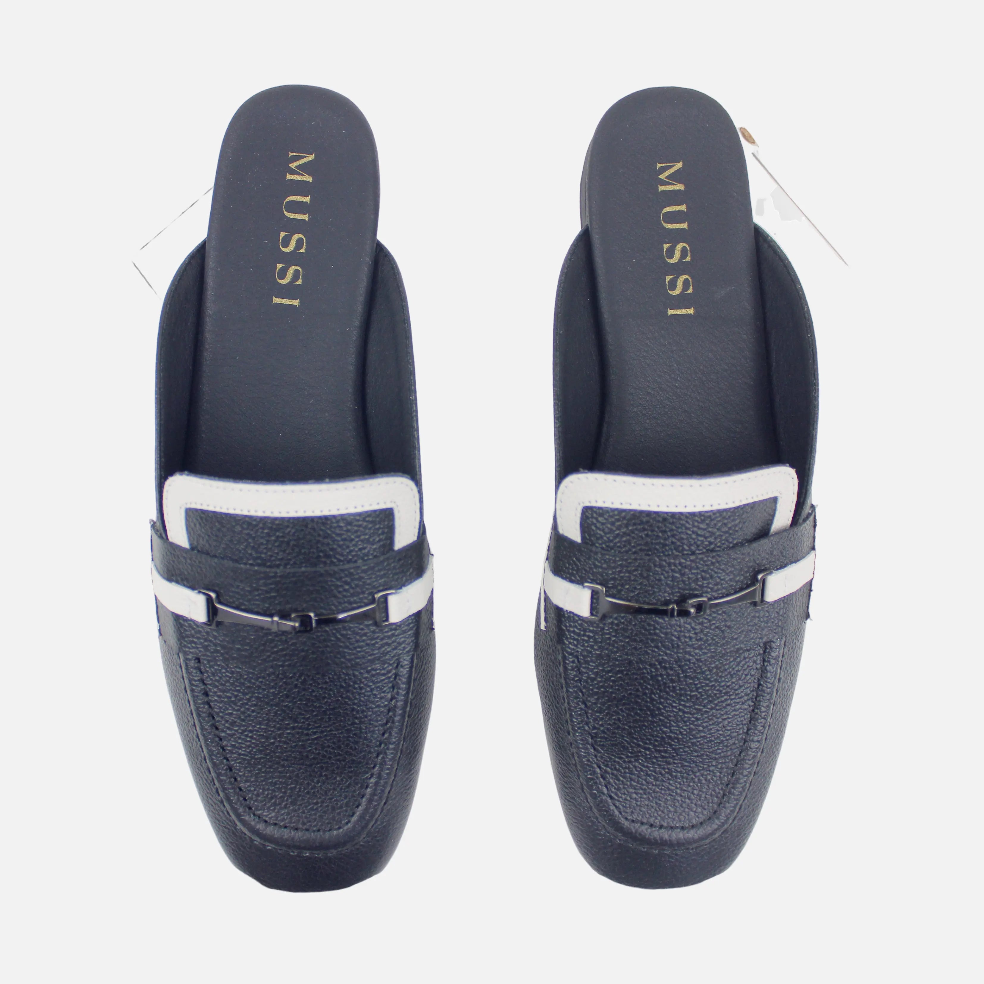 Zueco plano con capellada en cuero, con suela en de 2 cm de altura y forro interno en sintético. Su diseño tipo mocasín con detalle decorativo en el empeine y acabado texturizado lo convierten en una pieza elegante y versátil. Ideal para looks casuales o de oficina, su estructura abierta en el talón permite calzarlo fácilmente y mantener el confort durante todo el día.